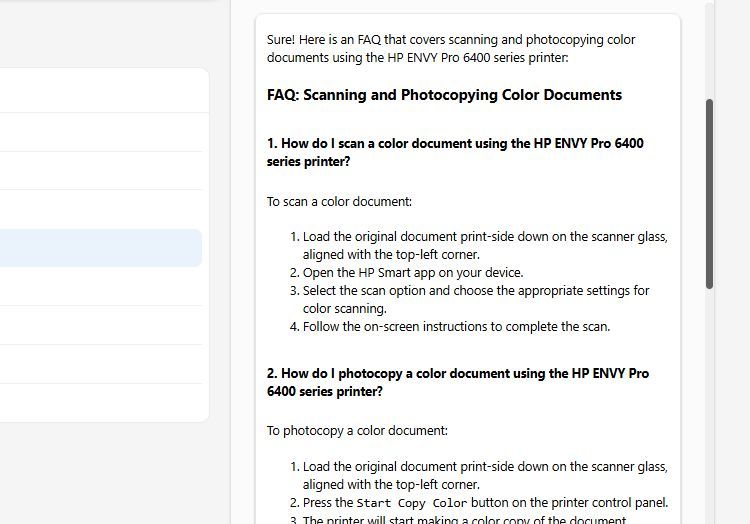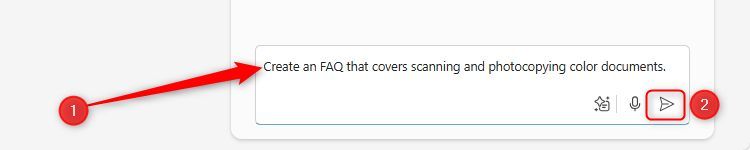 Tiếp theo, trong trường văn bản của thanh bên, hãy nhập Tạo câu hỏi thường gặp về quét và photocopy tài liệu màu và nhấp vào mũi tên "Gửi".