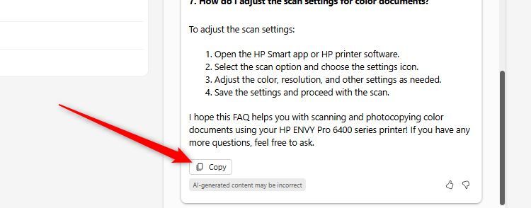 Bây giờ, hãy nhấp vào "Sao chép" ở cuối phản hồi của Copilot.