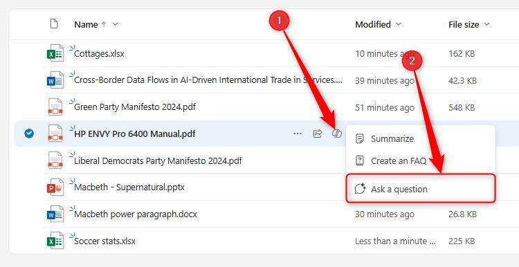 Thay vào đó, sau khi tải xuống hướng dẫn ở định dạng PDF và lưu vào OneDrive, hãy di chuột qua tài liệu, nhấp vào biểu tượng "Copilot" và chọn "Đặt câu hỏi".