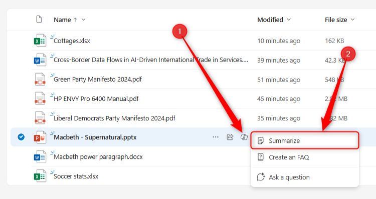 Để thực hiện việc này, hãy di con trỏ qua tệp trong OneDrive trực tuyến, nhấp vào biểu tượng "Copilot" và chọn "Tóm tắt".