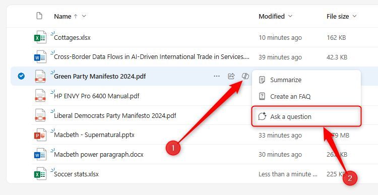Vẫn theo chủ đề bầu cử, lần này, bạn đã tải xuống bản tuyên ngôn của Đảng Xanh ở định dạng PDF và bạn muốn tìm hiểu xem đảng này có kế hoạch triển khai gì cho những người tự kinh doanh. Di con trỏ chuột qua tệp trong OneDrive, nhấp vào biểu tượng "Copilot" và chọn "Hỏi một câu hỏi".