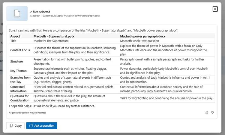 Sau vài giây, Copilot sẽ tạo ra một bảng với tên tệp là tiêu đề cột và mỗi hàng chứa một so sánh ngắn gọn và trực tiếp. Vì hai tệp chứa nội dung và chủ đề tương tự nhau nên kết quả sẽ đi sâu vào chi tiết của chúng.