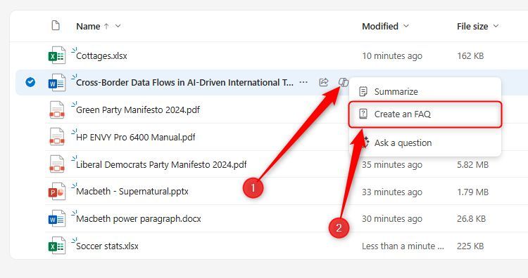 Để chuẩn bị cho việc này, bạn có thể yêu cầu Copilot tạo một bộ Câu hỏi thường gặp. Di con trỏ chuột qua tệp trong tài khoản OneDrive trực tuyến của bạn, nhấp vào biểu tượng "Copilot" và chọn "Tạo Câu hỏi thường gặp".