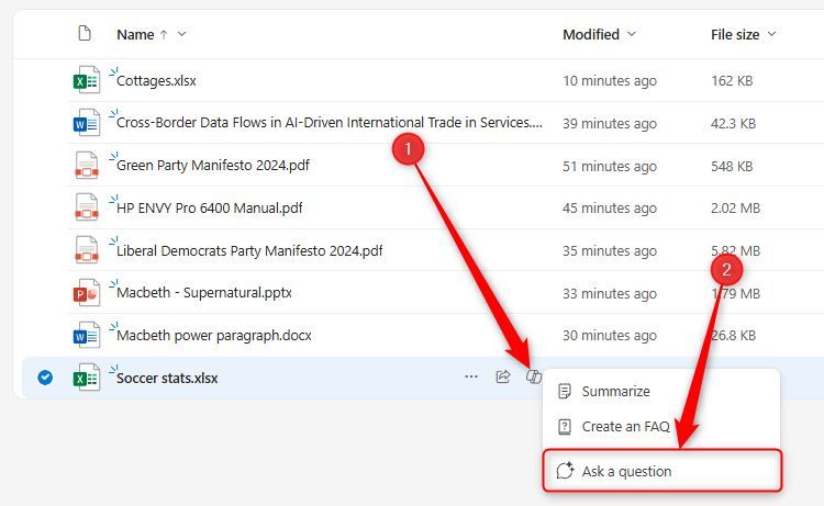 Để thực hiện việc này, hãy di chuột qua tên tệp trong OneDrive trực tuyến, nhấp vào biểu tượng "Copilot" và chọn "Đặt câu hỏi".