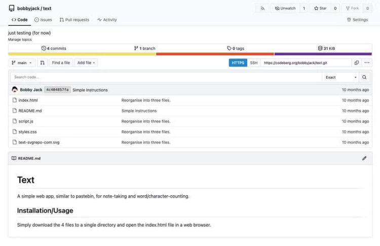 Giao diện của Codeberg rất quen thuộc nếu bạn đã từng sử dụng GitHub, mặc dù thiết kế của nó có phần tối giản hơn. Dịch vụ này cạnh tranh mạnh mẽ về tính năng, với các tính năng tương đương cho hầu hết những gì GitHub cung cấp. Nó cũng có dịch vụ bản địa hóa, Codeberg Translate, cho phép bạn tận dụng sự hỗ trợ của cộng đồng để dịch ngôn ngữ.