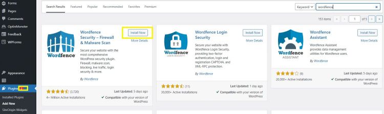 Trước tiên, chúng ta sẽ cài đặt phiên bản miễn phí của plugin Wordfence. Để thực hiện, hãy đăng nhập vào bảng điều khiển WordPress của bạn và điều hướng đến  Plugin > Thêm mới. Sau đó, tìm kiếm Wordfence  và nhấp vào Cài đặt ngay  trong mục Bảo mật Wordfence – Quét tường lửa & phần mềm độc hại: