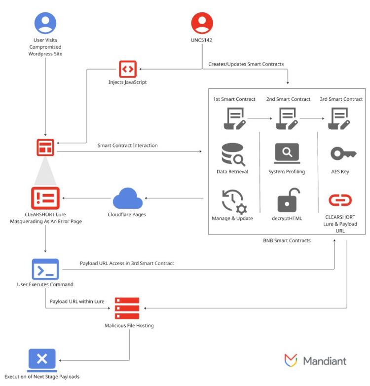 Google Threat Intelligence Group (GTIG) cho biết trong một báo cáo chia sẻ với The Hacker News: "UNC5142 được đặc trưng bởi việc sử dụng các trang web WordPress bị xâm phạm và 'EtherHiding', một kỹ thuật được sử dụng để che giấu mã độc hoặc dữ liệu bằng cách đặt chúng trên một blockchain công khai, chẳng hạn như BNB Smart Chain".